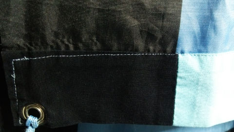 旗布の旗竿側には、6cm ほどの幅を木綿の布(ブロード、シーチング等)にて補強しています。ちなみに以下の写真では旗のデザインに合わせて補強布の色も変えたりしていますが、今になってみるとそこまでこだわることもなかったかなとも思ったり。補強布を手縫いで縫い付けるのは直線とはいえ大変なので、ミシンがあると便利です。